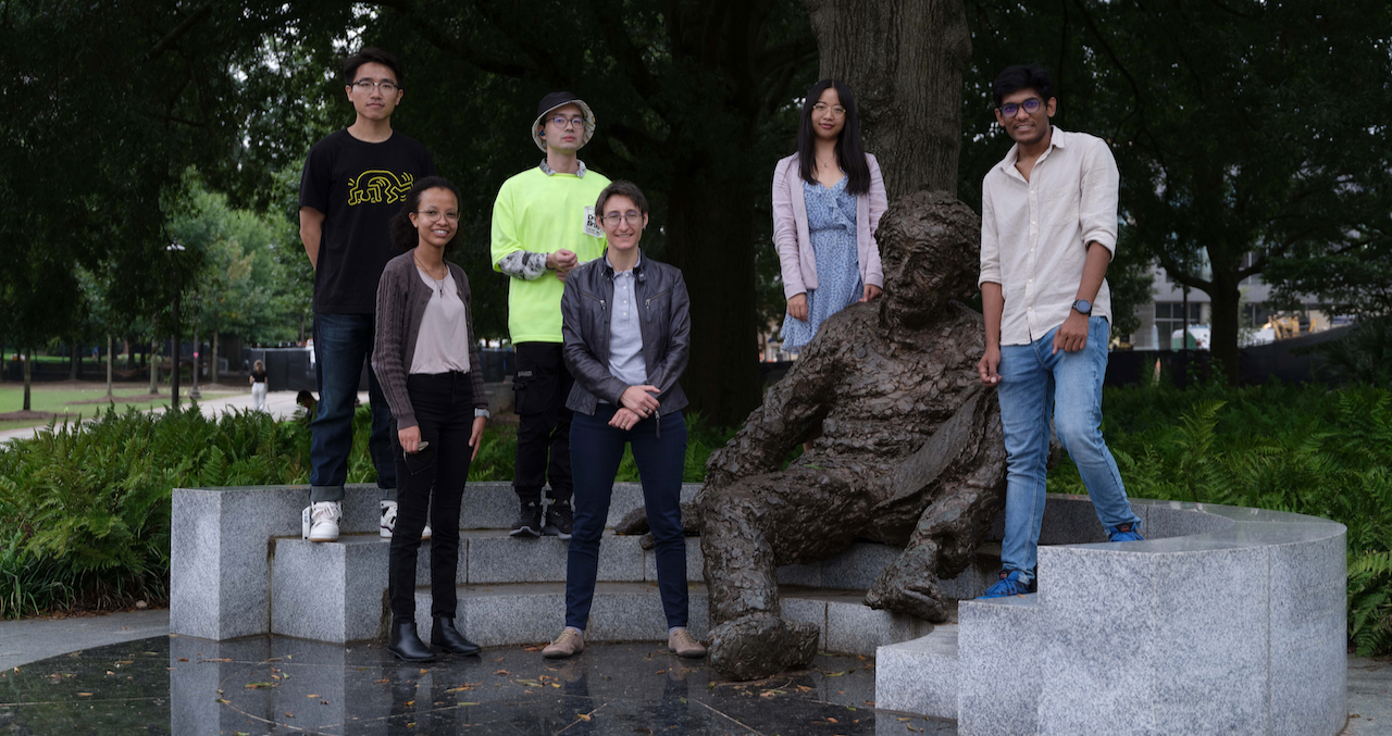 | Mr. Haozhou He (Ph.D. student), Ms. Meron Belachew (Ph.D. student), Mr. Daniel Chou (Ph.D. student), Dr. C. Arson, Ms. Tingting Xu (Ph.D. student), [sculpture of Albert Einstein], Mr. Vivek Bokkisa (Ph.D. student) |